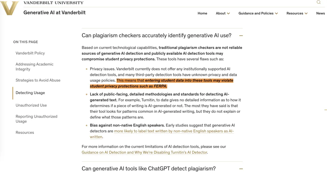 也有不少学校担心,AI检测工具会侵犯学生的隐私。范德堡大学在官网表明,未经学生允许的情况下,将学生的作业喂给AI检测工具的行为,可能会违反FERPA等学生隐私保护规定。