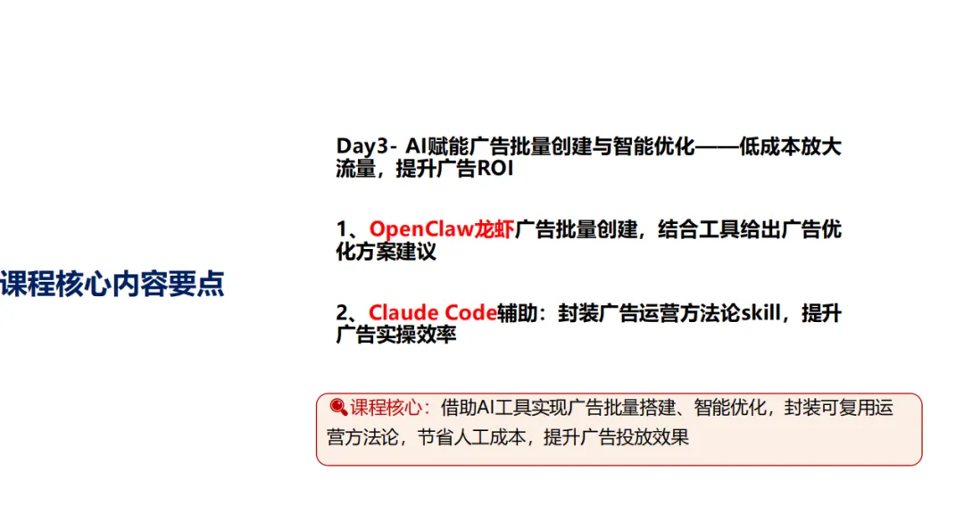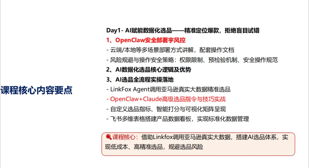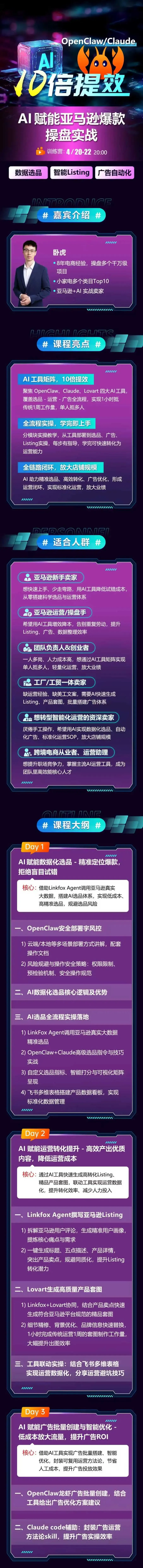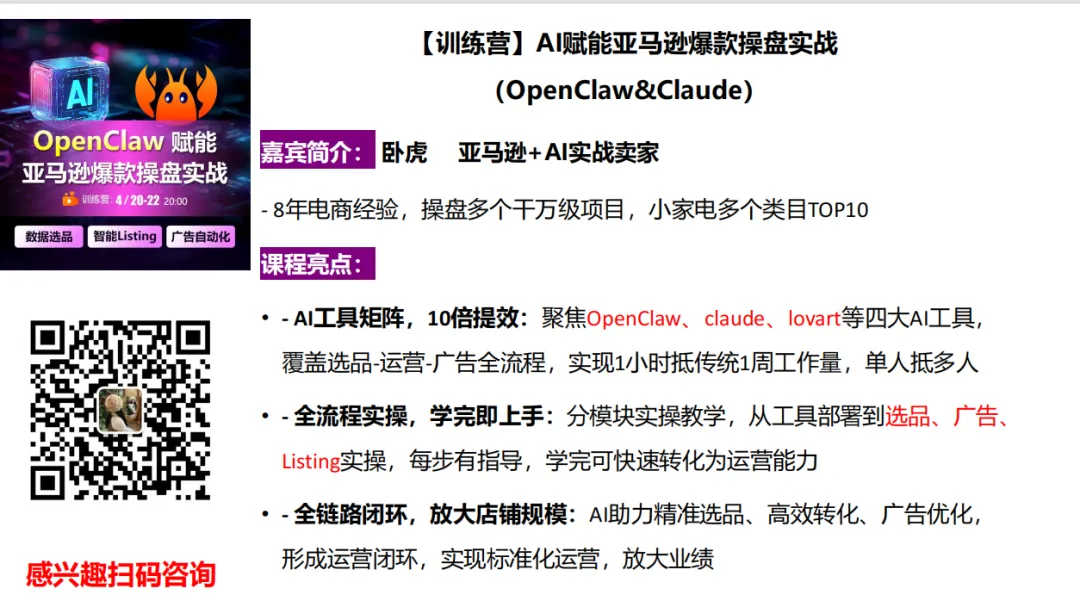 ��龙虾(OpenClaw)&亚马逊爆操盘实战!最新内容-十倍提效!!🔥AI赋能数据化选品-精准定位爆款,拒绝盲目试错🔥AI赋能运营转化提升-高效产出优质内容,降低运营成本🔥AI赋能广告批量创建与智能优化低成本放大流量,提升广告ROI这是这场线上直播课程适合的人群!感兴趣点击扫码咨询~