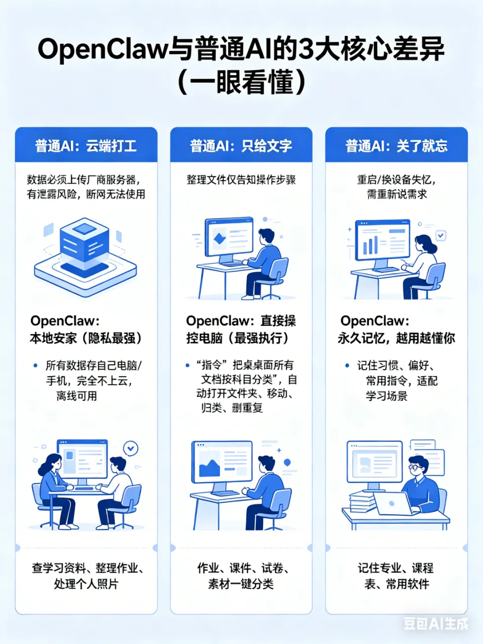 1. 普通 AI:云端打工;OpenClaw:本地安家(隐私最强)