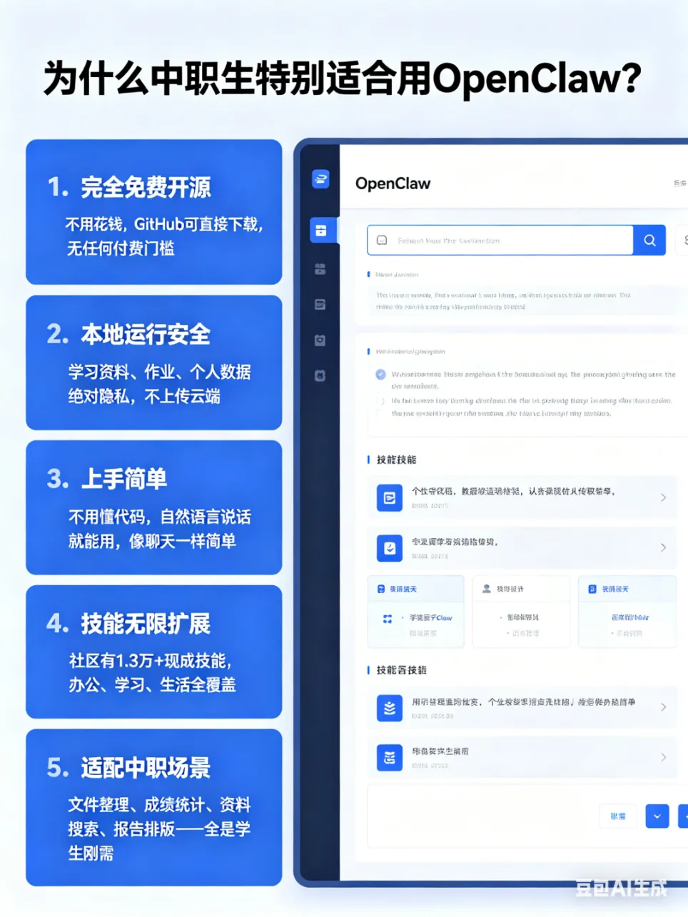 今天要给大家介绍的 OpenClaw(圈内人称 "小龙虾"),就是来改变这一切的:它不是只会聊天的 AI,而是能直接操控你电脑、帮你落地执行任务的 "数字助理"。尤其对咱们中职生来说,学习、生活、实训、作业全场景都能用,而且免费、开源、本地运行、隐私安全。
