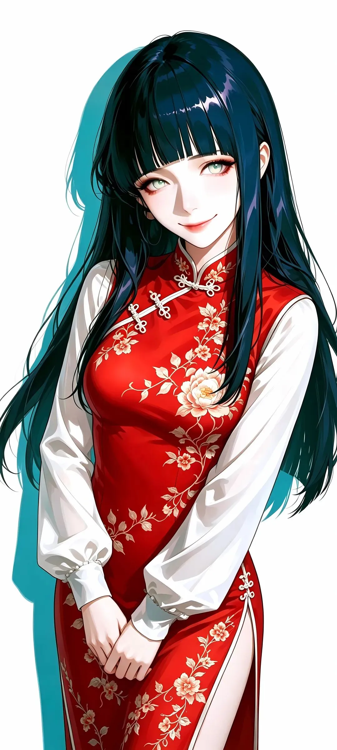 1个女生,黑长直齐刘海,淡蓝色眼睛,精致五官,冷白皮,妆容精致,白色改良旗袍,无袖立领款,胸前镂空,黑色水墨花卉印花,修身显瘦,丝绸质感,国风旗袍,性感曲线,交叉手臂站姿,红色背景,AI绘画,高质量,超高清,8k,光影柔和
