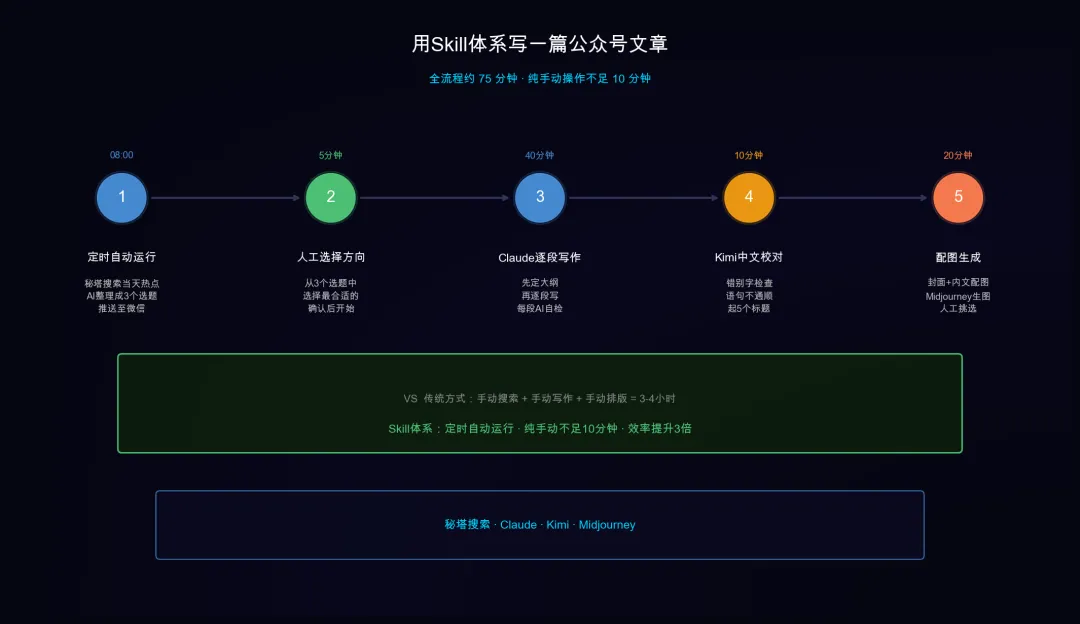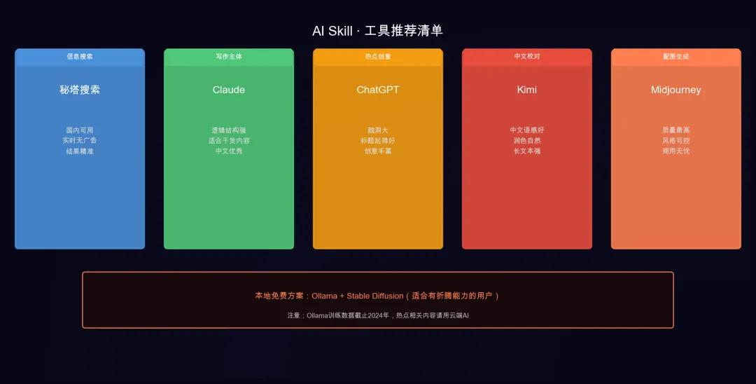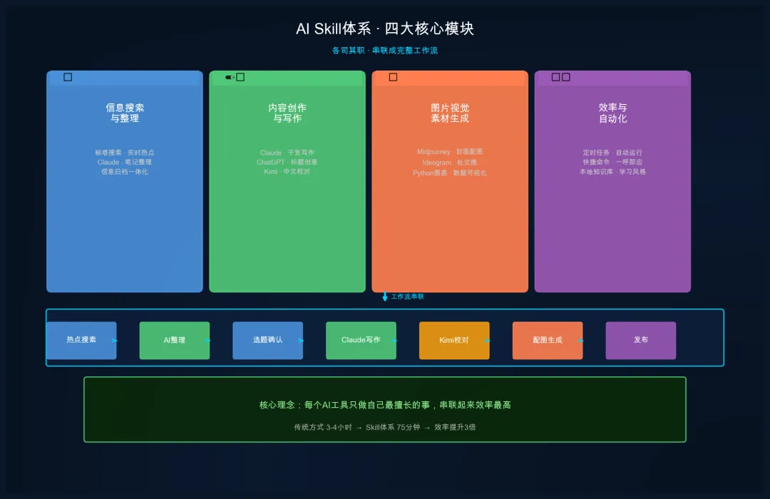 AI应用Skill体系:怎么让AI真正成为你的生产力工具适合谁看:已经会用一些AI工具,但感觉零零散散、没有形成体系的人。上次说完硬件配置,有读者问:工具选好了,但具体怎么用起来?这是很多人都卡住的地方。会用ChatGPT、会用Claude,但每次都是打开一个网站、问一个问题、关掉。感觉AI就是个高级搜索引擎,并没有真正改变工作方式。问题出在哪?在于没有把AI工具串联成一套工作流。今天介绍一套我自己用了一年、觉得真正有效的方案:AI Skill体系。什么是AI Skill体系简单说,就是把不同的AI工具串联起来,让它们各干各的活、各负责一段,形成一条完整的工作流水线。打个比方:你要做一顿饭,不是让一个大厨从买菜开始一直做到洗碗。而是有人负责买菜、有人负责切菜、有人负责炒菜、有人负责摆盘。每个人只干自己最擅长的事,整体效率最高。AI Skill体系就是这个逻辑。每个AI工具就是一个人,有的擅长搜索信息、有的擅长写文案、有的擅长检查错误。你把它们串起来,就变成了一条完整的AI工作流。为什么要用Skill体系,而不是一个AI工具用到底用一个AI工具从头用到尾,有三个明显的问题。第一,能力上限卡住了。再强的AI也有自己擅长的领域,用它做不擅长的事,效率低、结果差。第二,产出质量不稳。让同一个AI同时做搜索、写作、核对,很容易出错。分工明确才能专业。第三,无法自动化。单一工具每次都要手动操作,Skill体系可以设置好之后自动跑,节省大量重复劳动。四大核心Skill模块我把日常用得最多的AI工作流,分成四个模块。每个模块介绍核心工具和怎么组合。模块一:信息搜索与整理负责这个环节的AI工具,主要做两件事:全网搜索最新信息、自动整理成结构化笔记。工具组合:秘塔搜索:做实时信息搜索,比传统搜索引擎更快,结果无广告Claude:负责把搜索到的信息整理成结构化的笔记和摘要,同时自动归档工作流:搜索工具查到最新资讯,丢给AI整理成笔记,同时自动归档到笔记软件里。全程不用手动复制粘贴。这个模块解决的最常见问题:写文章不知道该搜什么、搜完不知道哪些有用、资料散落在各个地方找不到。模块二:内容创作与写作这是最多人用的环节,但大多数人都用错了方法。正确姿势不是让AI一次性写完整篇文章,而是分段来做:第一步,用AI定选题和大纲。把一个主题丢给AI,问它:这个角度读者会感兴趣吗?帮我列三个小标题,每个小标题下面写什么?第二步,让AI写开头和结尾。这两个部分最重要,决定读者会不会继续看下去。第三步,每个小标题单独写。写完一段让AI检查一遍逻辑有没有问题、有没有重复。第四步,AI做校对。检查错别字、语句不通顺的地方,同时让AI用不同语气重新表达一遍,看哪个版本更好。工具组合推荐:写作主体用Claude,逻辑强,适合写干货内容需要更多创意角度时用ChatGPT,脑洞大,适合起标题需要追热点时用秘塔搜索,实时性好校对和润色用Kimi,中文语感好模块三:图片与视觉素材生成写完文章,需要配图。大多数人的做法是去网上找图,或者用别人的图。这样有两个问题:一是有版权风险,二是图和内容不一定匹配。正确做法是用AI生成。不同场景用不同的AI:配图和封面图:用Midjourney,生成质量最高,风格最可控。给出准确的需求描述,出来的图可以直接用。信息图和图表:用Python配合Matplotlib,把数据变成直观的图表。写硬件对比文章必备。小红书配图和社交媒体图:用Ideogram,文字渲染最准确,不会出现奇怪的字母变形。工作流:先在文章里标注好这里需要什么图、图的风格和尺寸要求,然后统一让AI生成,最后人工挑选最合适的。模块四:效率与自动化这个模块是让Skill体系真正拉开差距的地方。核心思路是:把重复性高、规则明确的工作,设置成AI自动完成,不需要每次手动触发。具体做法:第一个,搭建本地AI快捷命令。把最常用的几个AI指令保存成快捷方式,下次用的时候直接调出来,不用每次重新写长长的提示词。第二个,设置定时任务。比如每天早上八点自动搜索当天热点、生成选题建议;每周日晚上自动整理本周内容产出、生成报告。第三个,搭建本地知识库。把所有写过的文章、收集的资料全部喂给AI,让它学习你的内容风格和方向。以后写文章直接问它:我这个方向之前写过什么?有什么可以延伸的角度?一个具体例子:写一篇公众号文章的工作流用Skill体系的思路来看,一篇文章从选题到发布,全流程是这样的。第一步,定时任务自动运行:秘塔搜索当天热点,Claude整理成三个选题,推送到微信。你随时拿起手机选一个方向,确认。第二步,打开电脑,AI已经把大纲列好了。把大纲发给Claude逐段输出,每写完一段让AI自己检查逻辑。第三步,中途需要查资料,调出秘塔,搜完直接整理成笔记粘贴进来。第四步,写完发给Kimi做校对,同时让它帮我起五个标题。第五步,选好标题,开始配图。用Midjourney生成封面图和内文配图,人工挑选最合适的。最后排版发布。整个过程,手机用来做决策和确认,电脑用来执行写作和生图。碎片时间处理选题,完整时间专注创作,不做无用功。怎么开始搭建自己的Skill体系不需要一步到位。从最痛的那个点开始。如果你每天都要写文章,先把内容创作模块搭起来。能节省每天半小时的重复劳动。如果你经常要做调研和信息整理,先把信息搜索模块搭起来。能让你快速获取和整理大量信息。如果你想真正