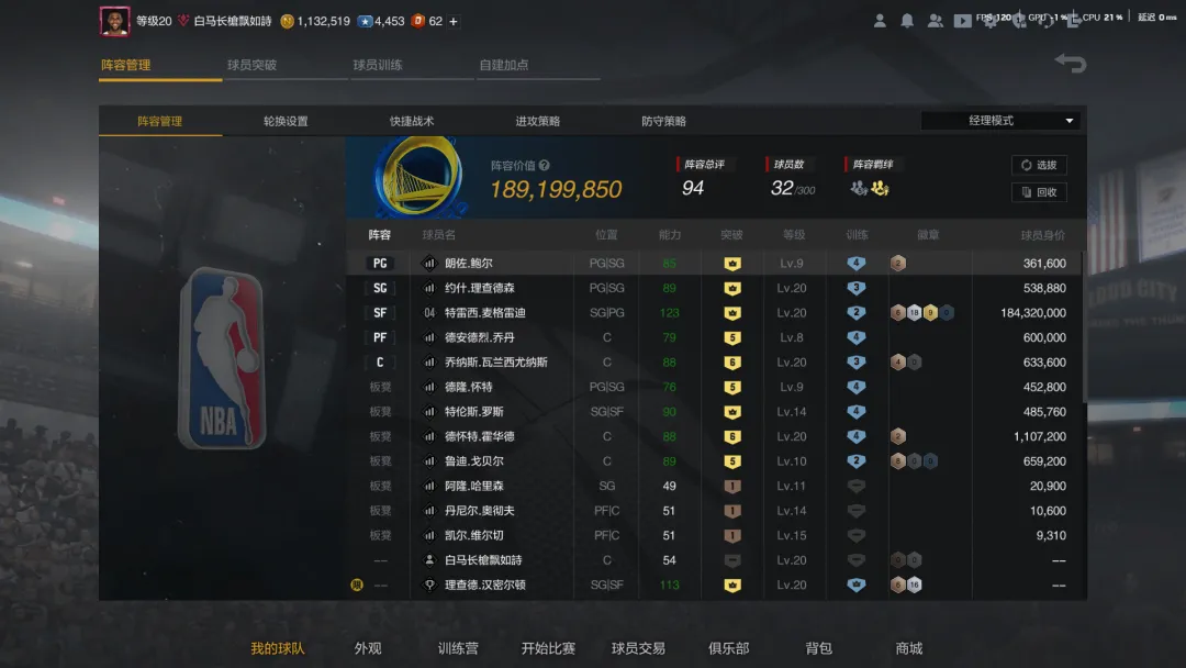 硬邦邦四件套,完全是挡拆和篮板作用,这四个人选得非常好,加起来300万但作用很高,从雷达图就能看出来,攻防双板表现都很好,保住了下限。后面也会发两套内线强大的阵容,即便外线比较弱,纯靠内线也能打出很好的效果。