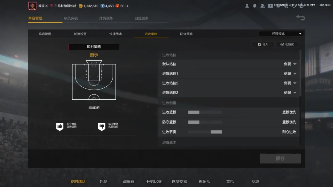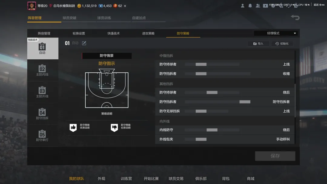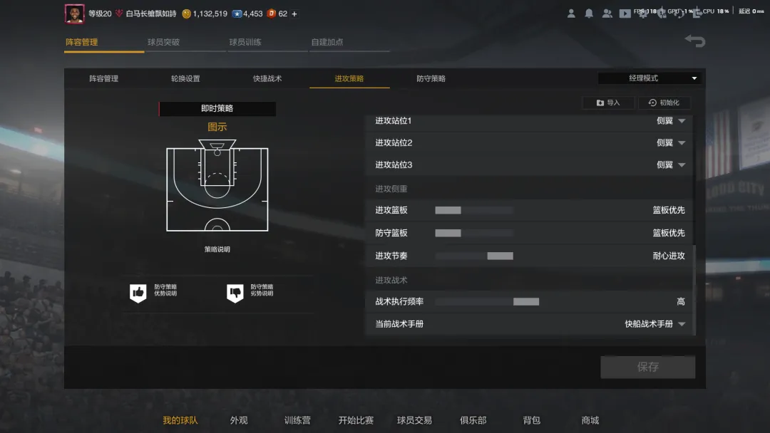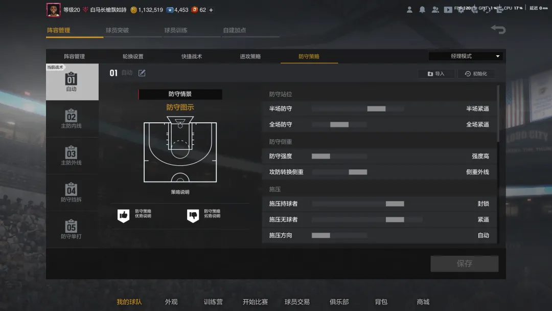 中投流也是投射为主,只不过是把三分战术换成了中投战术,整体思路差不多,都要主射和副射,所以套组也可以无脑选侧翼。中投的球队手册主要就是快船和雷霆,快船更干净一些,就主打一个战术,个人更推荐快船;雷霆主打两个战术,一个战术比较差(成功率低),另一个战术能跑成三分,算是下限比较低,中投其实更看下限,因为就上个超巨而已,所以雷霆相对没那么推荐。防守策略全场紧逼+单防套