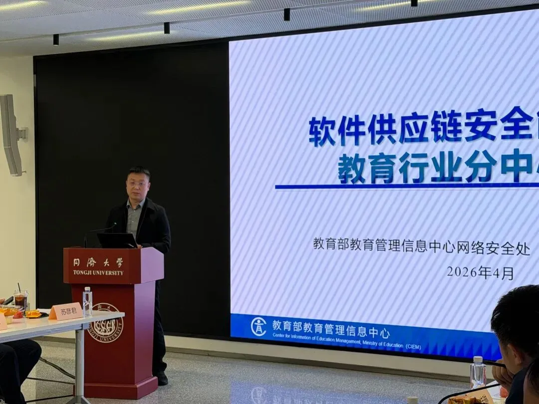 为深入贯彻落实国家网络安全战略,全面提升教育行业软件供应链安全治理能力,4 月 10 日下午,由教育部教育管理信息中心主办、同济大学承办的教育系统软件供应链安全专题座谈会在同济大学中法中心顺利召开。教育部教育管理信息中心、上海市教育委员会、公安部第三研究所及全市20 余所高校相关负责人齐聚一堂,共商教育系统软件供应链安全治理路径,共筑校园数字安全屏障。