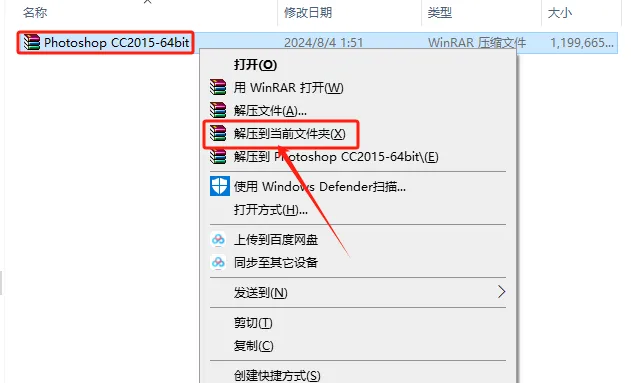 1.打开下载的Ps软件安装包,鼠标右击压缩包选择【解压到当前文件夹】。
