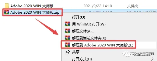 1.选中下载的压缩包,然后鼠标右键选择解压到“Adobe 2020 WIN 大师版”(没有解压选项点这里)