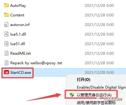 3.在打开的文件夹,找到并选中“StartCD.exe”,鼠标右键选择“以管理员身份运行”
