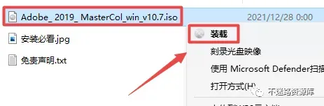 2.打开刚刚解压的文件夹,找到并选中“Adobe_ 2019_ MasterCol_win_v10.7.iso”文件,鼠标右键选择“装载”(如果没有“装载”选项的可以右键选择“打开方式—Windows资源管理器”打开,Win7系统点击鼠标右键解压)