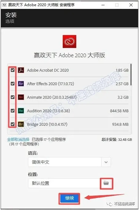 5.勾选想要安装的软件,默认为全选,可以选择软件安装路径,点击“继续”