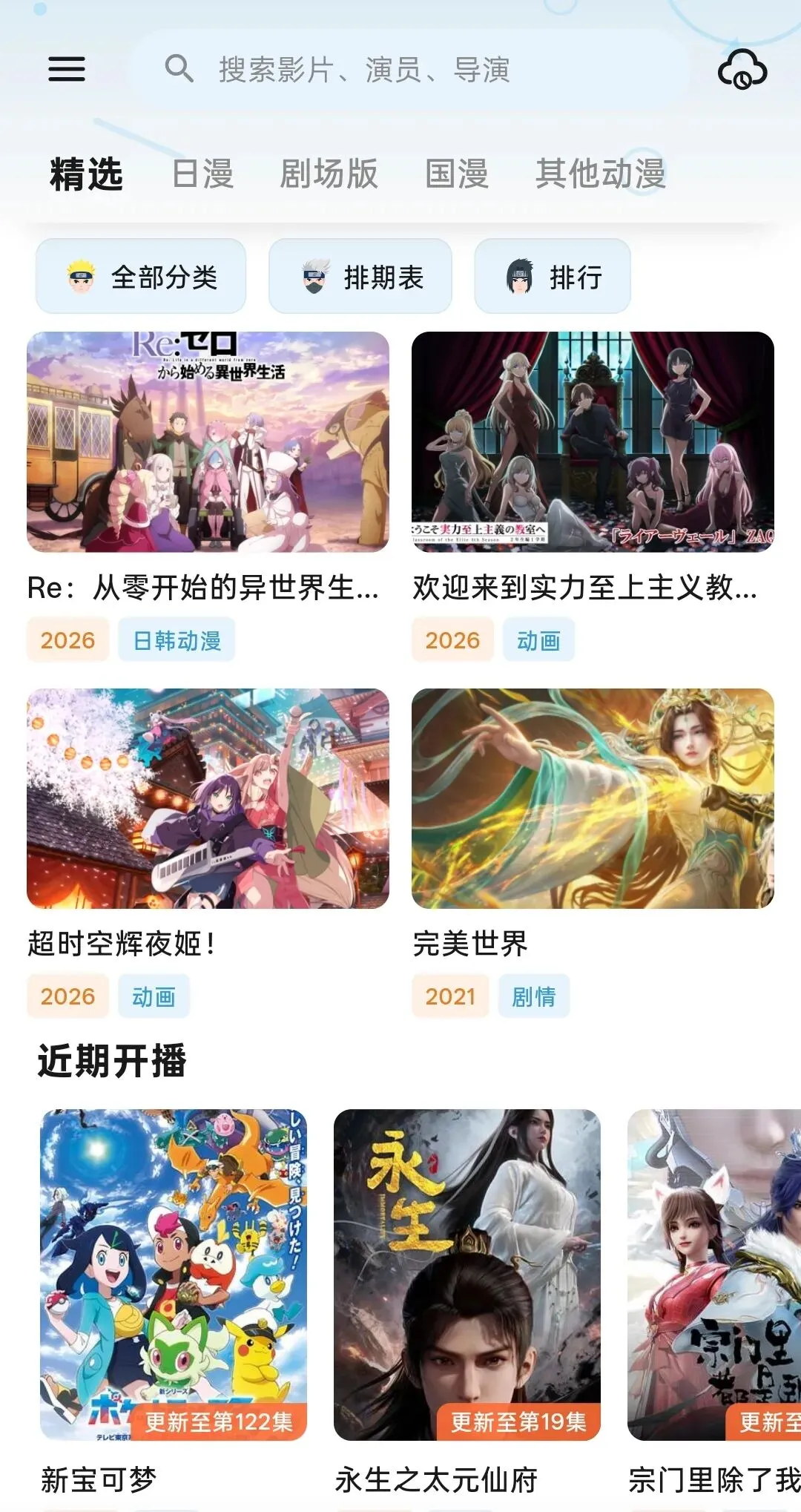 app的整个界面设计还是比较清新,首页对动漫类型有分类,也可以通过下面分类标签自己筛选,当然也能够通过上方的搜索框找你想看到番。