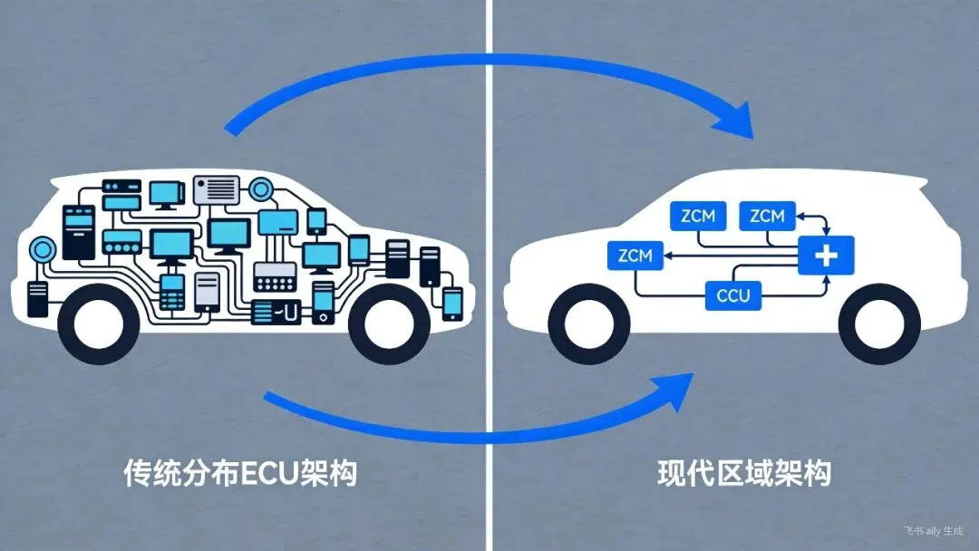 传统分布式ECU架构痛点 1ECU数量:250+ 1线束复杂度:极高,总长度可达数公里 1软件管理:分散,每个ECU独立开发维护 1功能扩展:困难,需新增ECU和线束 1通信网络:异构复杂,存在多种总线协议 | 区域架构核心优势 1ECU数量:约10个(ZCM+CCU) 1中央计算:算力集中,统一调度 1软件管理:集中化,便于OTA更新 1硬件标准化:边缘节点简化,可复用性高 1网络统一:趋向以太网等高带宽主干网 |