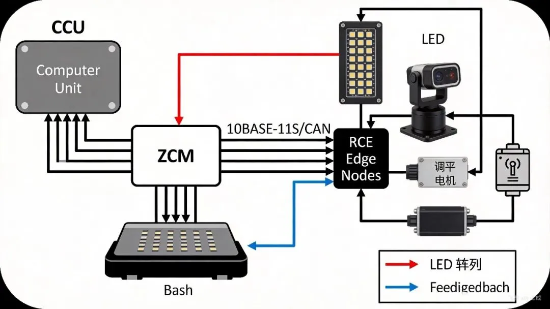 汽车前照灯系统是RCE技术应用的理想场景,其功能正从简单的照明向智能视觉系统演进,包含自适应远光、像素级遮蔽、动态转向照明等复杂功能。传统架构下,前照灯控制通常依赖一个独立的灯控ECU,内部包含MCU、LED驱动芯片、CAN收发器等,系统复杂且软件封闭。