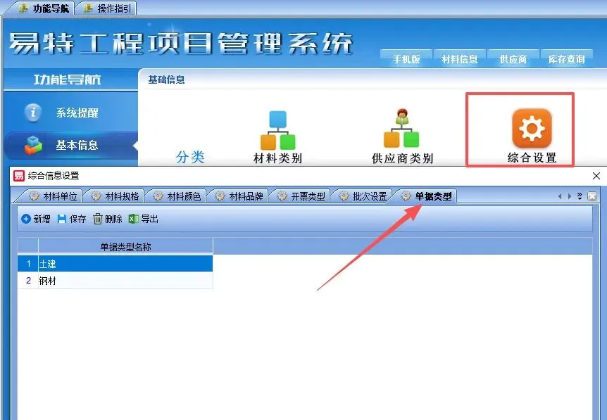 先在【基本信息】模块的【综合设置】--【单据类型】设置好单据审核人员的分类,即同一张单不同的材料类型可以提交给不同的人员进行审核。