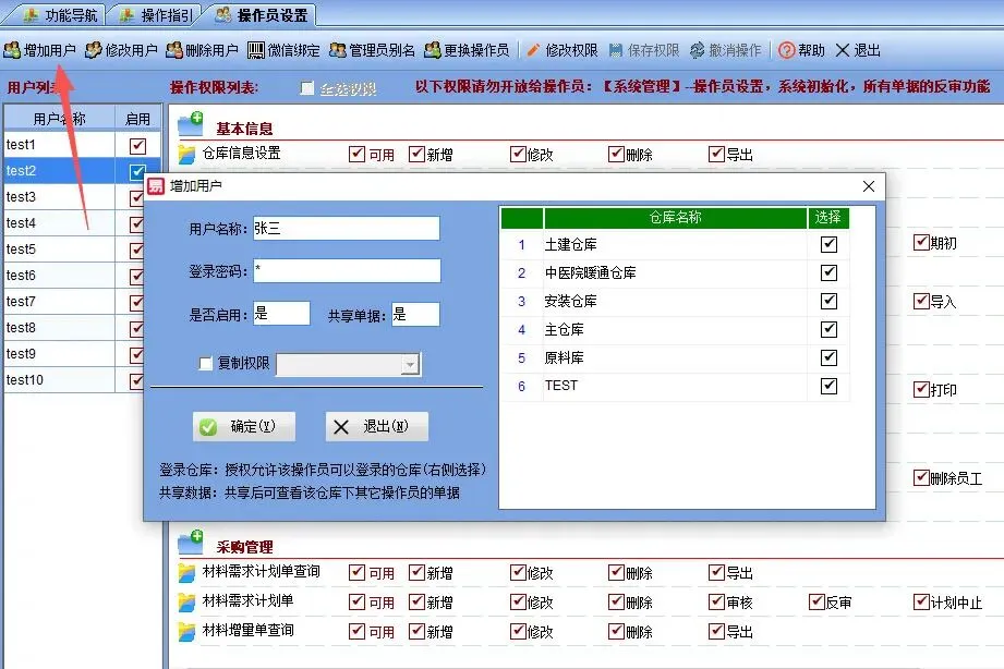 【系统管理】---【操作员设置】,点击【增加用户】,添加好操作员的姓名和密码,并分配好相关单据的权限。