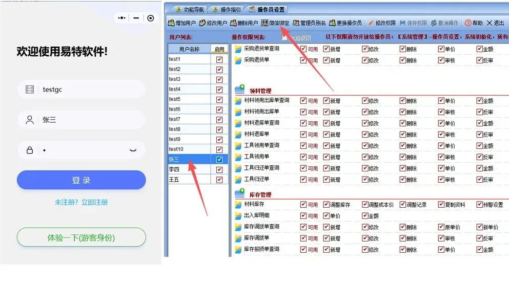 3、打开 【系统管理】---【操作员设置】,在左边选中刚才的操作员如张三,并点击【微信绑定】按钮,用张三的微信扫码进行绑定。