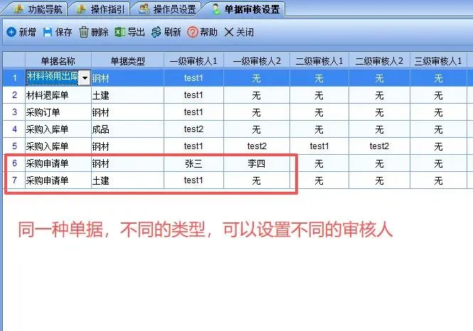【系统管管理】--【多级审核设置】,新增好需要多级审核的单据,如【采购申请单】,并选择之前第1步建立的单据类型,根据实际情况设置每一级的审核人,同一级可以同时设置2个审核人也可以只设置1个审核人,提交的时候由提交人员决定提交给谁,系统最多支持6级审核,还可以设置一个【特审人】,流程进入到中间任何审核层级,这个【特审人】是可以直接审批通过,跳过后续的审核流程。