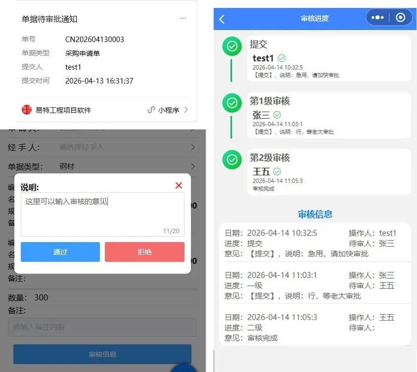 在工程项目施工的过程中经常缺少某种材料,如何快速的在手机上直接填写申请,项目管理人员可以在手机上进行审批,通过以后就可以进行采购的流程,这需要先在易特工程项目管理系统中设置好审核的流程,下面给出具体的操作方法。