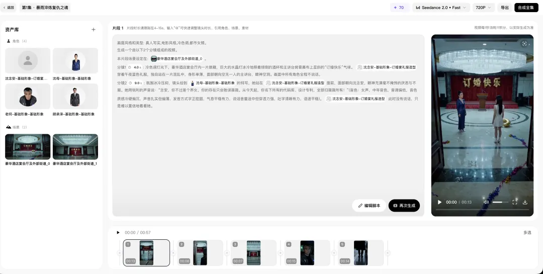 关键不是「写出剧本」,而是「结构化剧本」。输出必须是机器可读的 JSON:每一集拆成若干镜头,每个镜头标注场景 ID、角色 ID、动作描述、对白、时长、机位。这一步决定了后续所有环节能不能自动化。