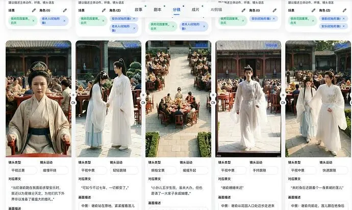 分镜脚本要包含:镜头类型(近景、全景、特写)、运镜方式(推拉摇移、环绕)、景别切换逻辑、节奏控制、情绪曲线。一集 5 分钟的短剧大约需要 15 到 25 个分镜,模型要一次性输出并保持逻辑连贯。