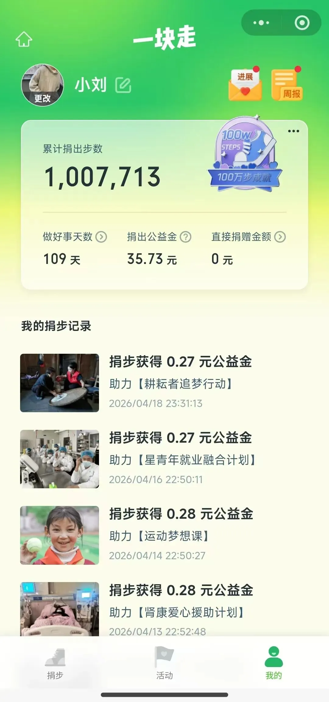 今天特意看了一眼记录:已经捐了109天,累计100万步,折成公益金35.73元。