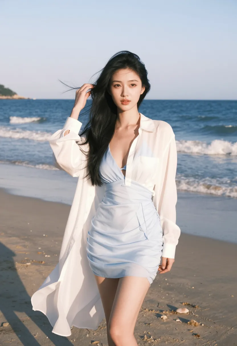 8K, ultra-detailed, masterpiece, best quality, portrait photography, seaside pause art style, Asian female standing by ocean, wearing elegant light blue summer dress, long black hair flowing in gentle sea breeze, graceful and seductive pose, standing with one hand touching hair blown by wind, other hand at side, body facing ocean, natural expression with peaceful gaze, scenic seaside setting with waves and horizon, golden hour sunlight, front view three-quarter shot, sharp focus on face and upper body, soft focus on ocean background, dramatic lighting from sun creating soft shadows, serene atmosphere, soft color palette (light blue, white, gold, blue), 85mm f1.4, cinematic depth of field
