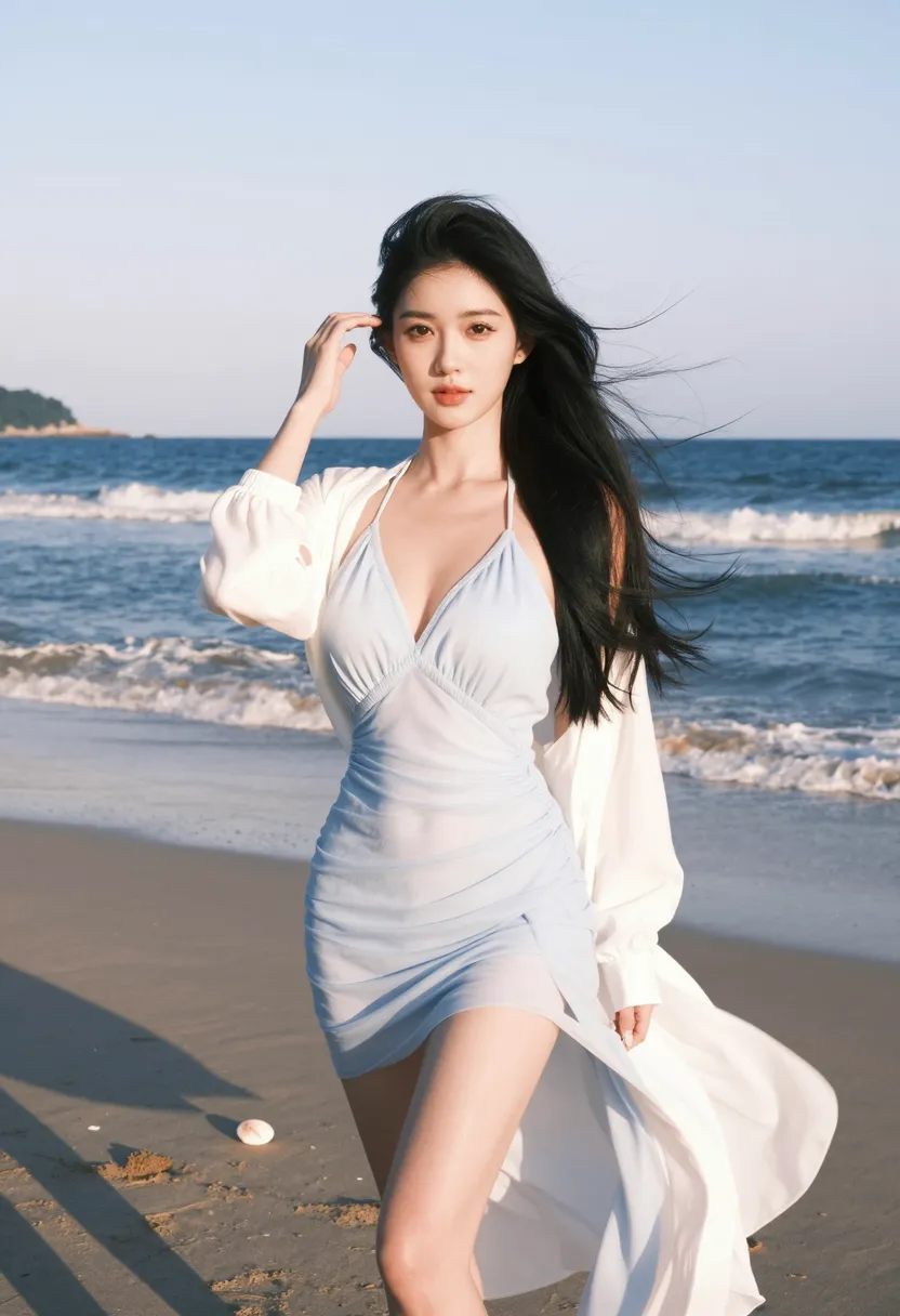 8K, ultra-detailed, masterpiece, best quality, beach photography, seaside walk art style, Asian female walking on sandy beach, wearing elegant white flowing dress, long black hair flowing in sea breeze, graceful and seductive pose, walking barefoot on sand with one hand holding dress hem, other hand naturally swinging, natural expression with bright smile, beautiful beach setting with white sand and clear blue water, soft morning sunlight, side view medium shot, sharp focus on body and face, soft focus on beach background, dramatic lighting from sun creating rim light on hair, refreshing atmosphere, fresh color palette (white, blue, gold, beige), 50mm f1.8, shallow depth of field, cinematic composition
