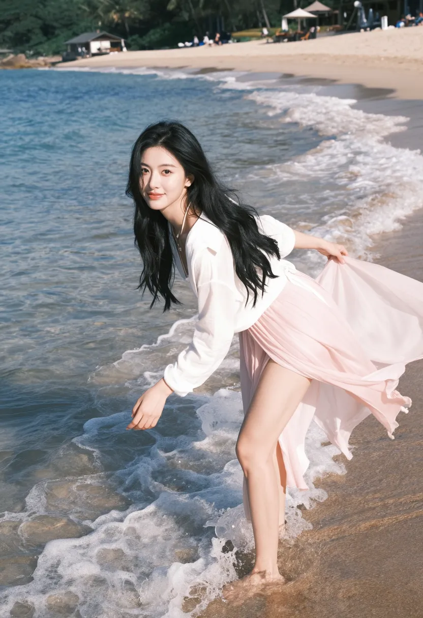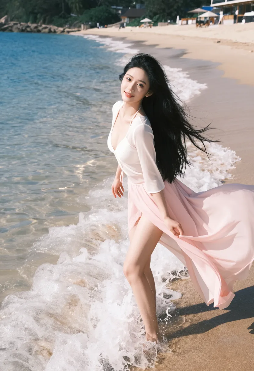8K, ultra-detailed, masterpiece, best quality, landscape photography, wave interaction art style, Asian female at water's edge, wearing elegant pink dress, long black hair in natural waves, graceful and seductive pose, standing in shallow water with one hand reaching toward waves, other hand holding dress, body slightly leaning forward, natural expression with gentle smile, beautiful beach setting with gentle waves and clear water, soft natural sunlight, low angle shot from side, sharp focus on body and waves, soft focus on ocean background, dramatic lighting from side creating water caustics, romantic atmosphere, vibrant color palette (pink, white, blue, gold), 35mm f1.8, cinematic composition