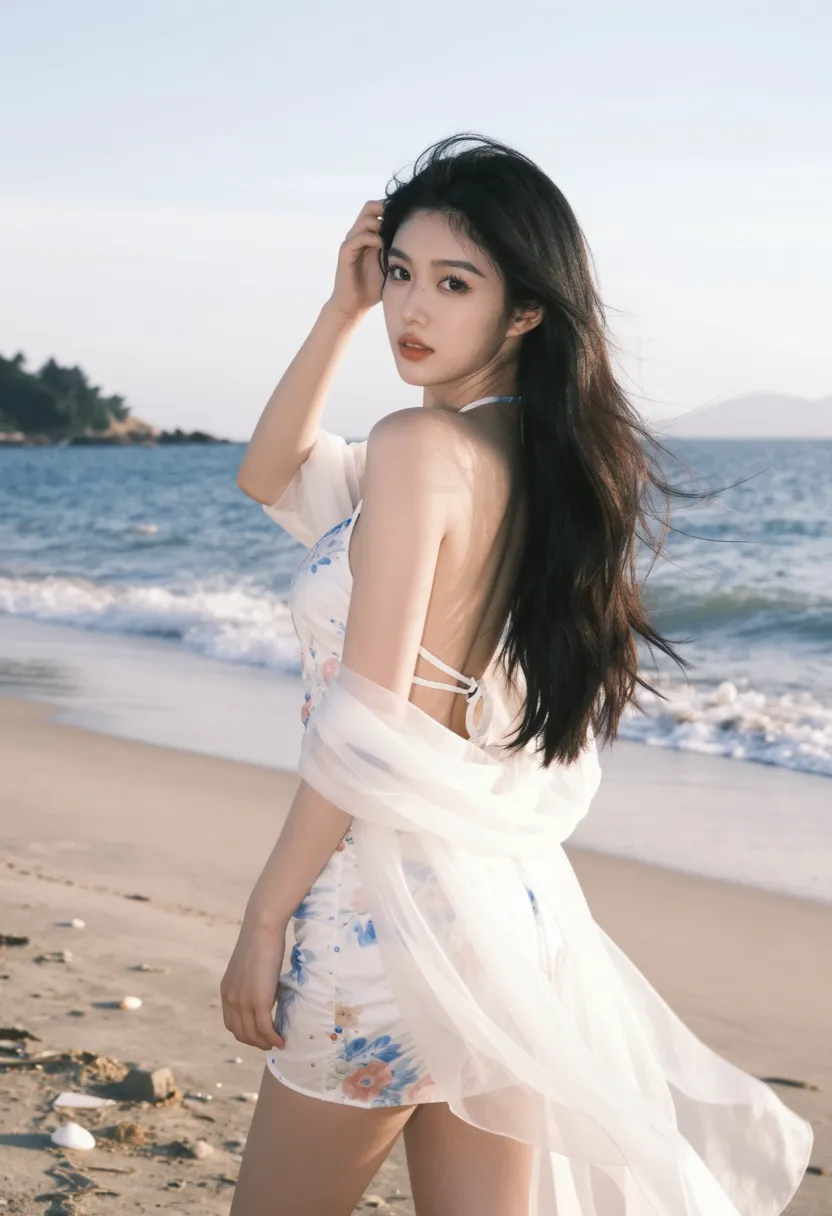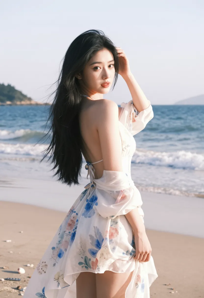 8K, ultra-detailed, masterpiece, best quality, intimate photography, seaside glance art style, Asian female looking back by ocean, wearing elegant white dress with floral patterns, long black hair cascading over shoulder, graceful and seductive pose, standing with body turned slightly, head looking back over shoulder, one hand touching hair, natural expression with alluring eyes, beautiful seaside setting with ocean and sky, soft afternoon light, back view turning to side, sharp focus on face and hair, soft focus on ocean background, dramatic lighting from behind creating rim light on silhouette, enchanting atmosphere, ethereal color palette (white, blue, pink, gold), 85mm f1.2, bokeh background