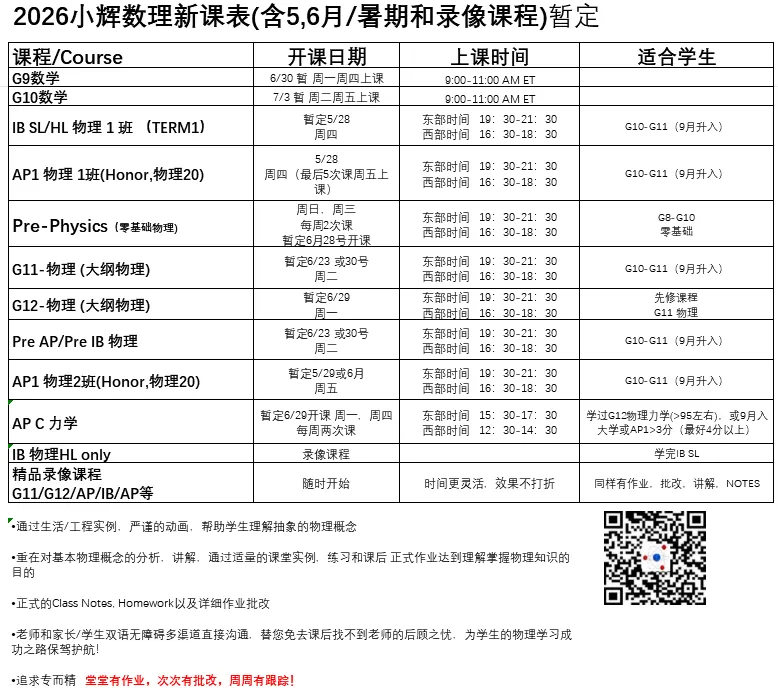 G11/Pre-AP/PreIB物理 6 月底暑假新班 +新课表