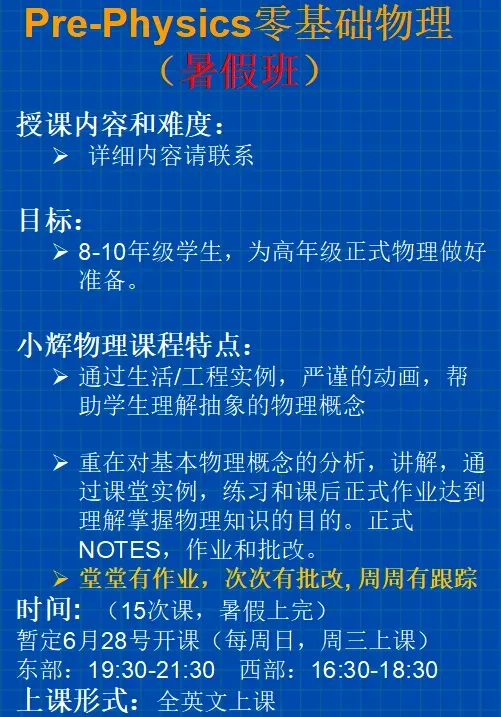 零基础物理Pre-Physics 暑期新班 15次课,暑假结束