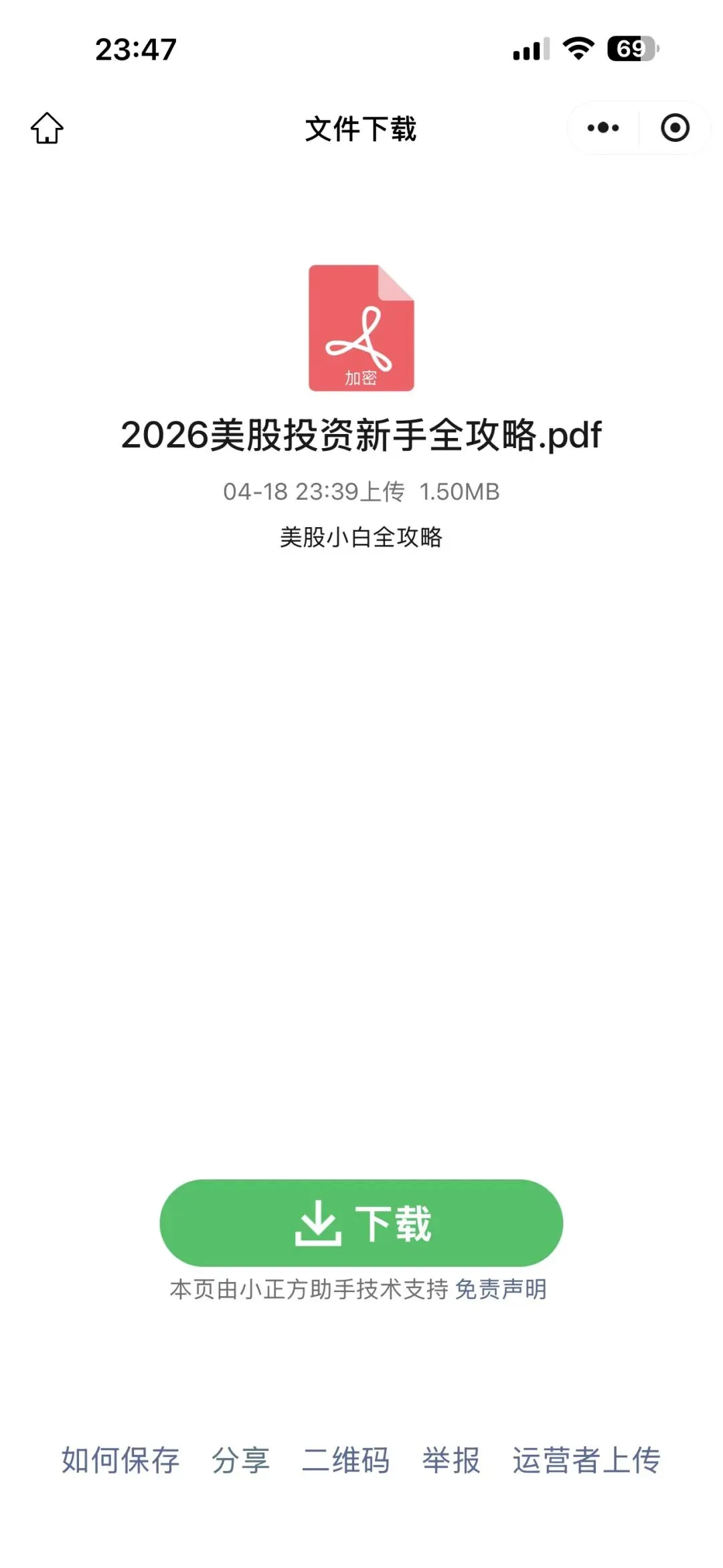 《2026美股投资新手全攻略》下载地址这是下载地址:《2026美股投资新手全攻略》如何免费领取这份 PDF?【转发此文➡️怎么买美股?这份 18 页全攻略免费送,3 分钟,小白也能学会】① 转发本文到朋友圈 ② 截图发至本公众号后台 ③ 回复关键词「攻略」。我们会在后台私信提供下载密码