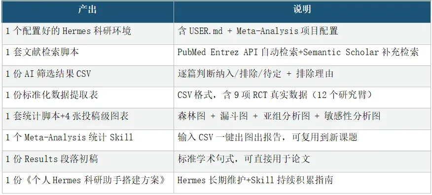 产出:Hermes科研环境 + 检索脚本 + 筛选结果 + 数据提取表