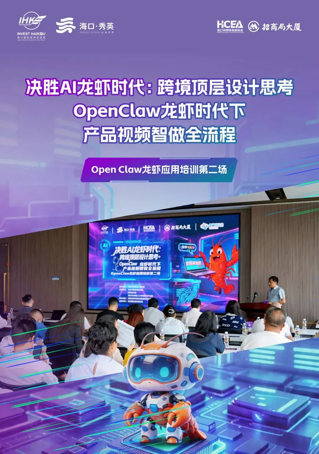4月17日,由海口市秀英区人民政府指导,海口市跨境电商协会、招商局大厦、海口市 (秀英) 人力资源服务产业园联合主办,海南您好传媒科技集团有限公司承办,海口国际投资促进局等支持的OpenClaw 龙虾应用培训第二场活动在招商局大厦顺利举办。本次培训以“决胜AI龙虾时代:跨境顶层设计思考+OpenClaw龙虾时代下产品视频智做全流程”为主题,汇聚80余名行业专家、企业代表及创业人士,紧扣人才培育主线,搭建优质学习交流场景,持续探索人工智能与跨境电商双向融合发展路径,夯实辖区产业人才根基。