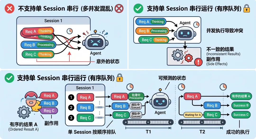 同一个 Session 不会同时乱跑多轮互相抢状态 可以避免工具调用和会话写入打架 能保持历史一致性