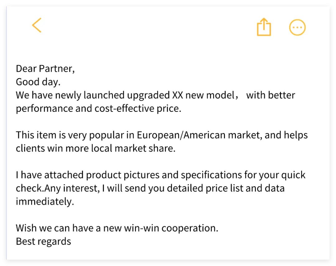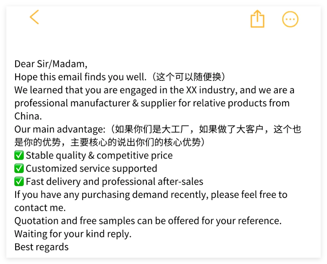 其实在大多数情况下,客户并非不需要你的产品,而是你的开发信往往刚开头就被划走了。要是内容长篇大论、只顾自说自话、通篇都是广告,老外会一秒钟就把你拉黑。