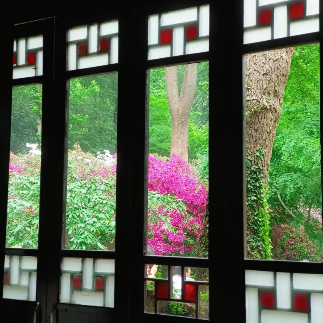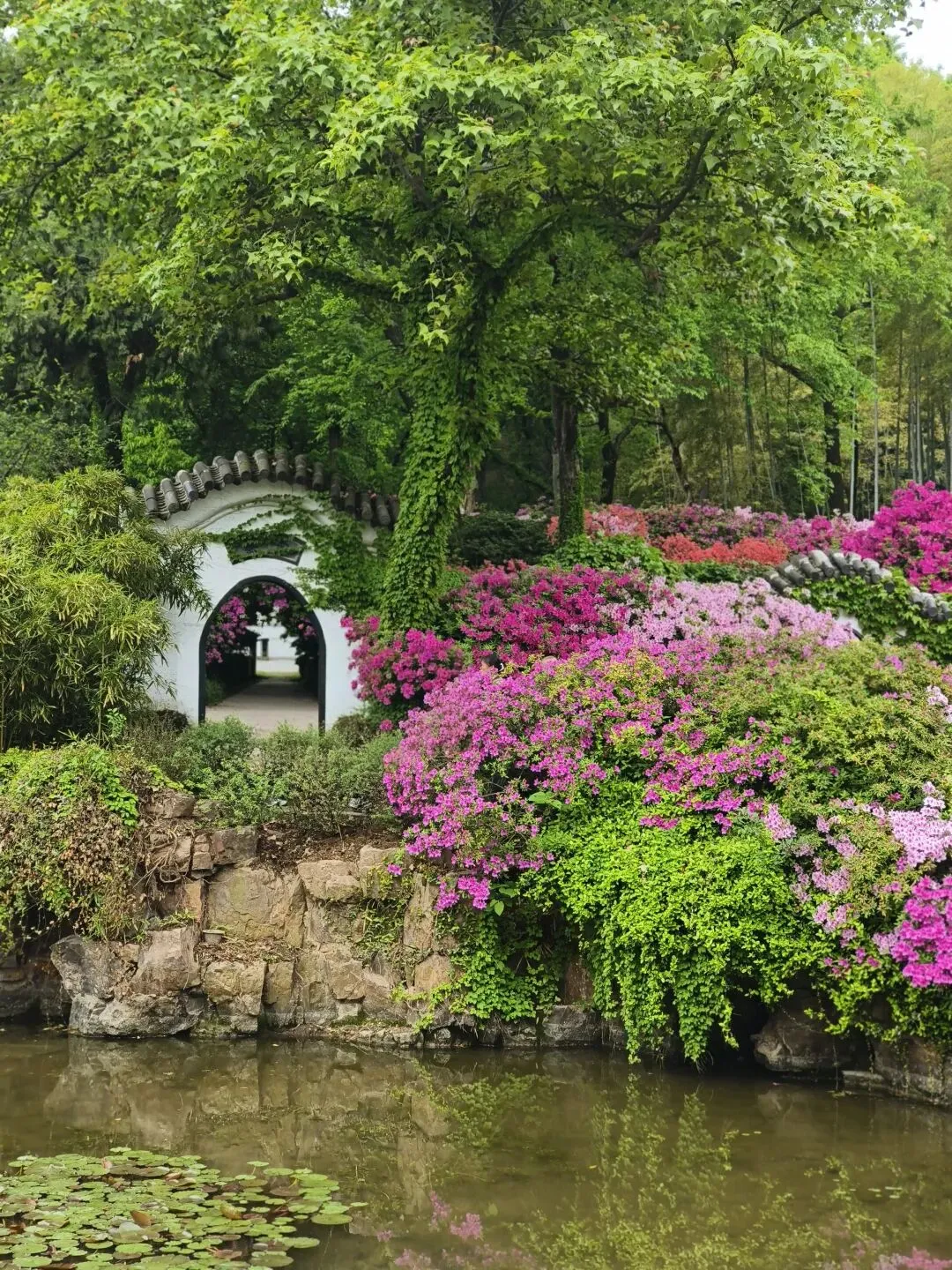 我沿着花海小径一路走一路拍,不同角度、不同风格的照片接连出炉:花团锦簇的墙边,背景是干净的白墙与垂落的杜鹃,清新又温柔;池水边,水面倒映着花影,静谧又浪漫;甚至在园林拱门处拍照,消除路人后,拱门与花海构成了完美的框景,自带中式美学的诗意。