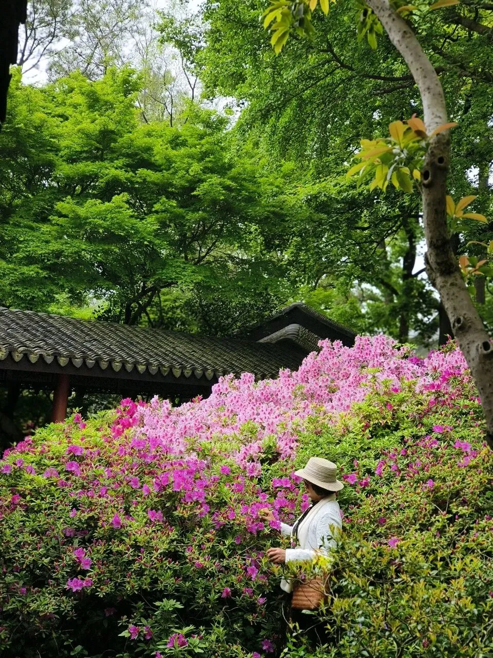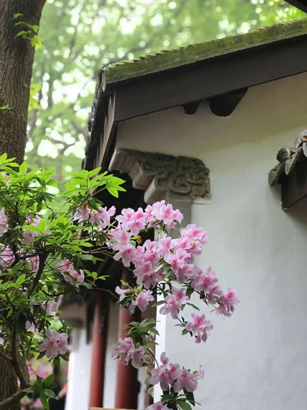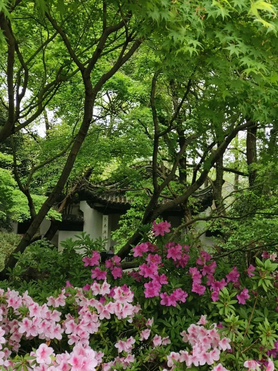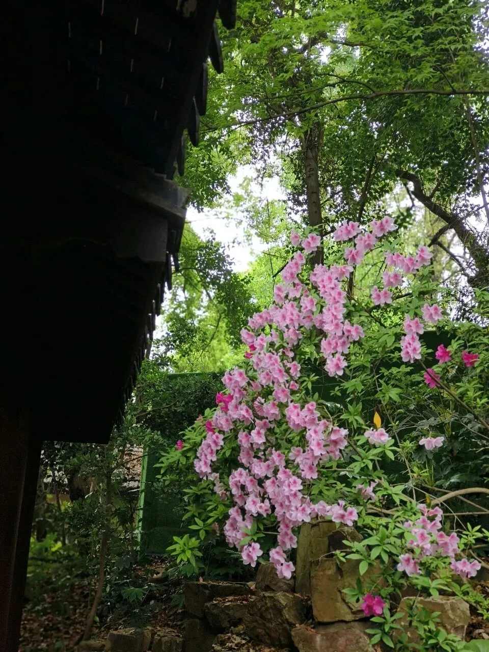 走进杜鹃园的瞬间,就被眼前的景象惊艳到了。高大的乔木撑起浓密的绿伞,层层叠叠的绿叶间,杜鹃花肆意绽放。有的攀附在白墙黛瓦的檐角,有的依偎在清澈的池水边,倒映出粉紫相间的花影,连空气里都弥漫着清甜的花香。