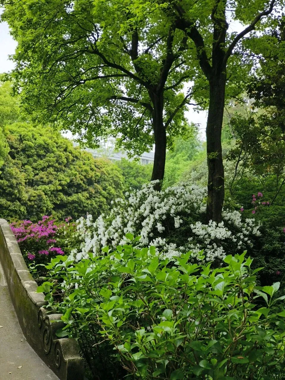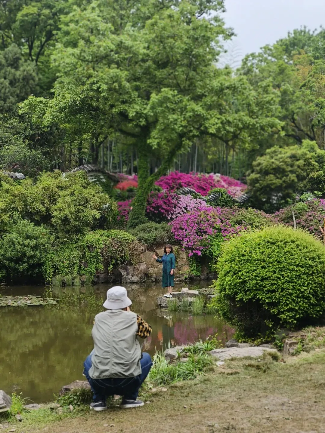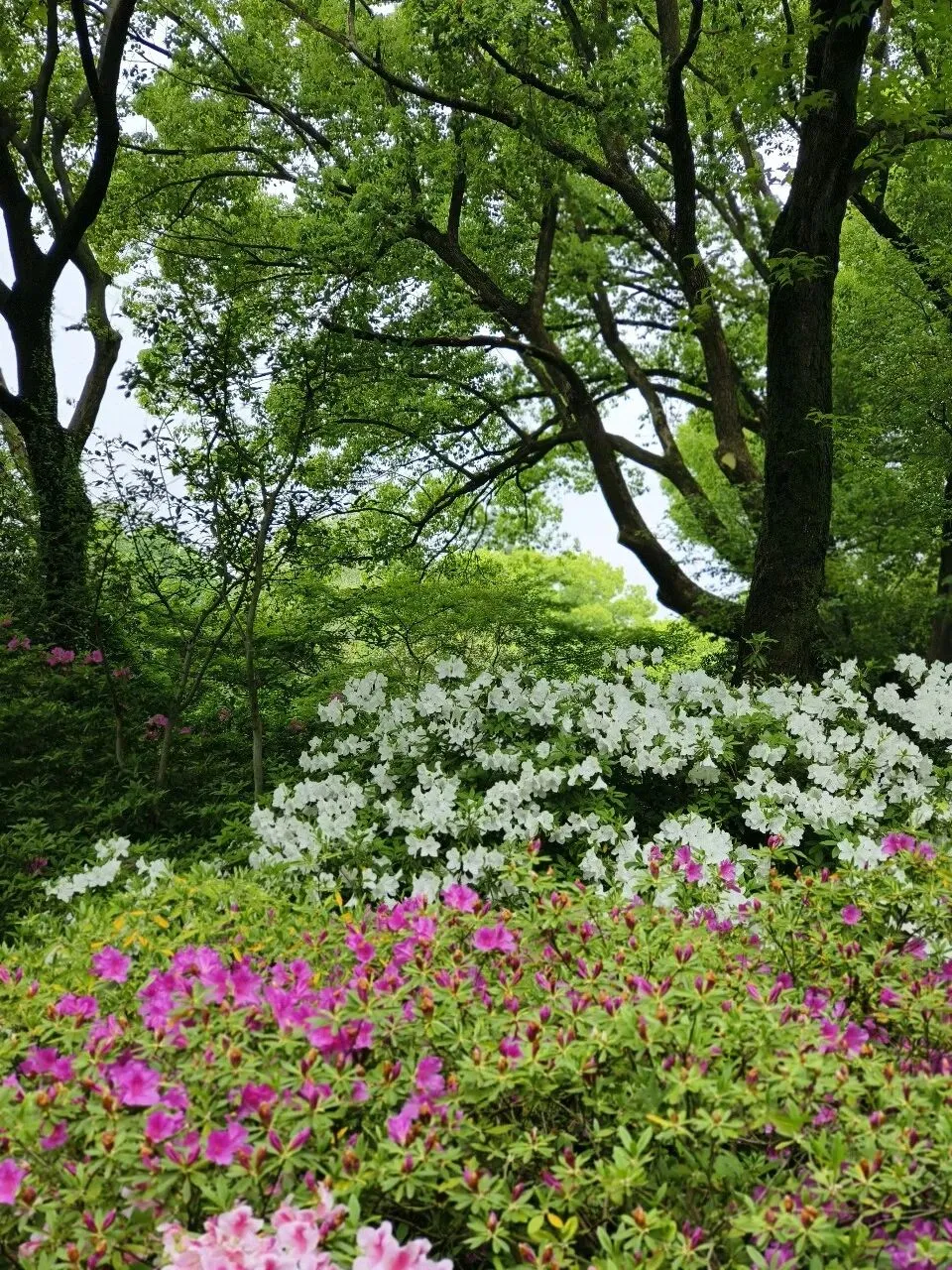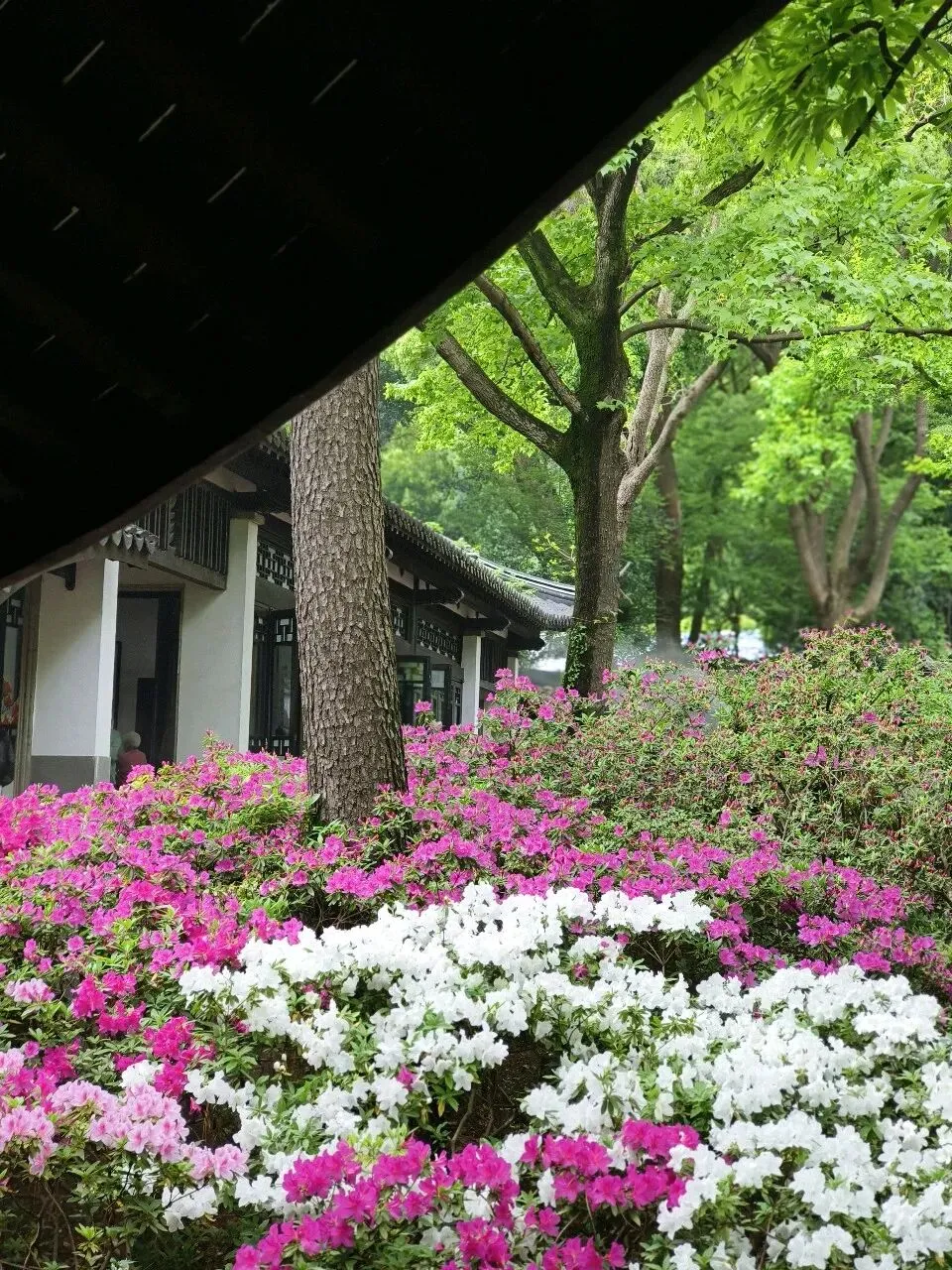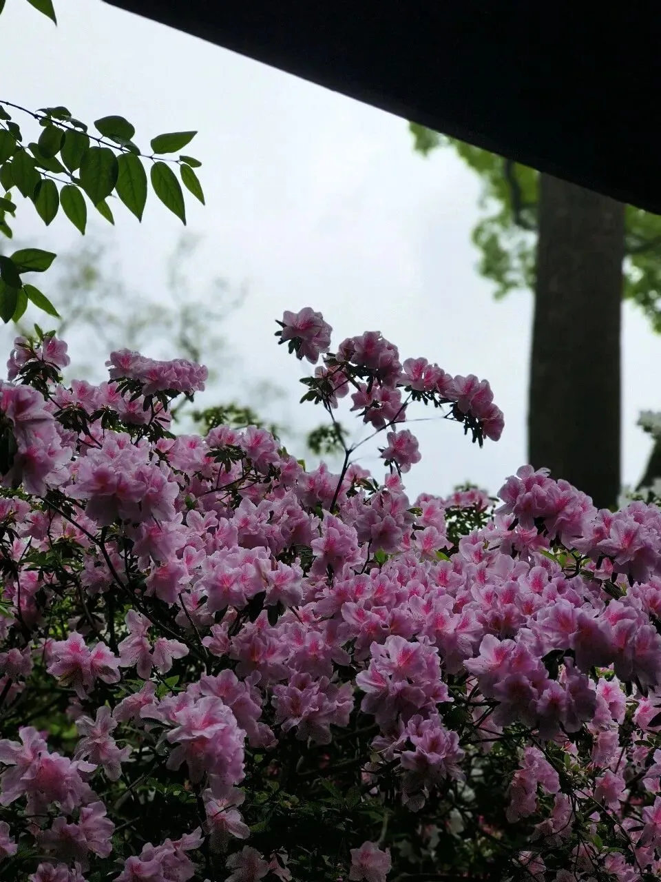 走进杜鹃园的瞬间,就被眼前的景象惊艳到了。高大的乔木撑起浓密的绿伞,层层叠叠的绿叶间,杜鹃花肆意绽放。有的攀附在白墙黛瓦的檐角,有的依偎在清澈的池水边,倒映出粉紫相间的花影,连空气里都弥漫着清甜的花香。