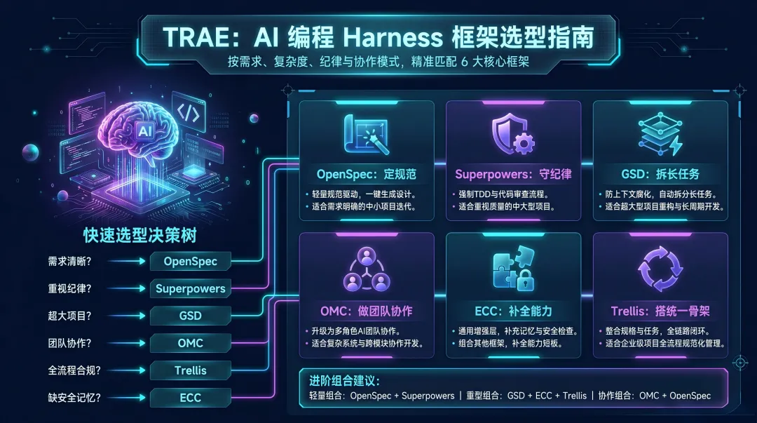 在 TRAE 中选择这 6 个 AI 编程 Harness 框架,核心是按需求清晰度、项目复杂度、工程纪律要求、团队协作模式来匹配:OpenSpec 定规范、Superpowers 守纪律、GSD 拆长任务、OMC 做团队协作、ECC 补全能力、Trellis 搭统一骨架。下面是完整拆解与选型指南。