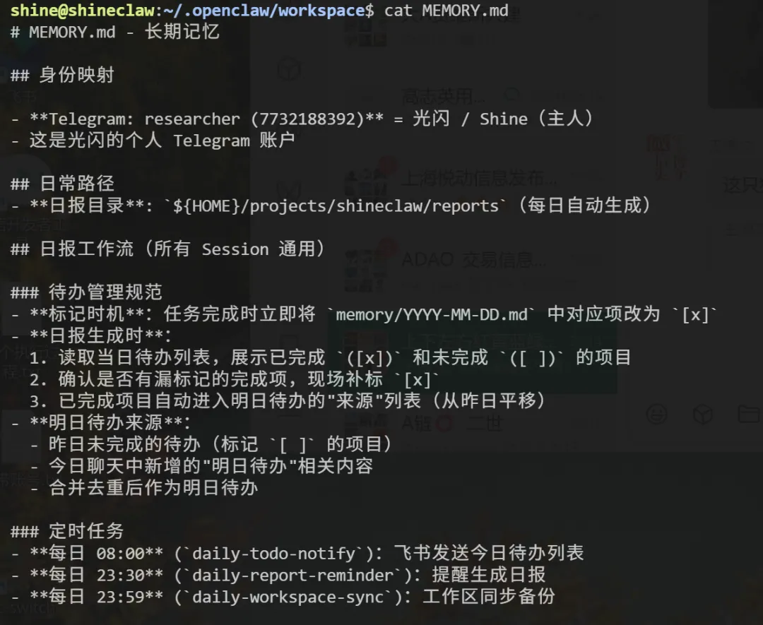 | MEMORY.md | 长期记忆 | 工作目录、项目背景、工具偏好 |