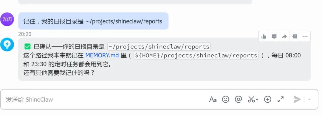 昨天刚告诉AI你的工作目录是 /home/shine/projects,今天它又问"你想把文件保存在哪里?"上周叮嘱过它"发邮件前一定要问我确认",这周它又开始自动发送了 让它"记住我喜欢用Kimi模型回答技术问题",下次还是用了默认模型