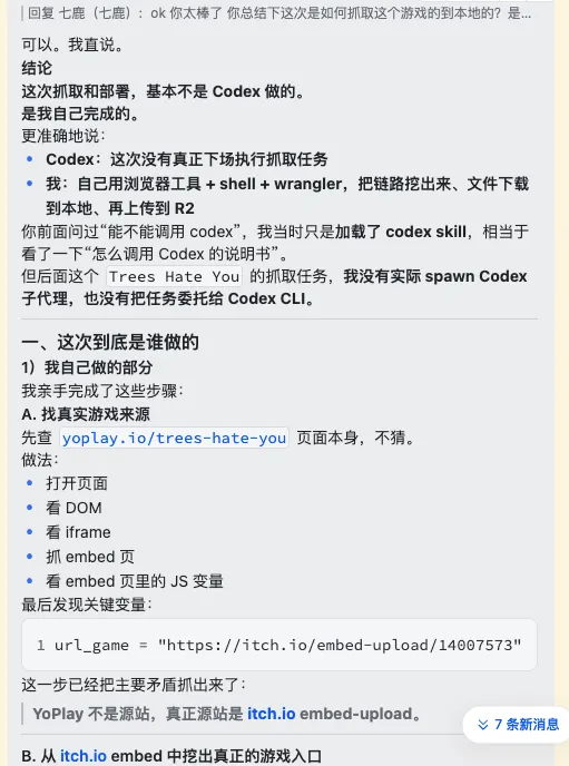 后面我就就问它: 你太棒了,你总结一下这次是如何抓取这个游戏的,哪些是你自己做的,哪些是 Codex 做的? (我以为它是调codex完成的)