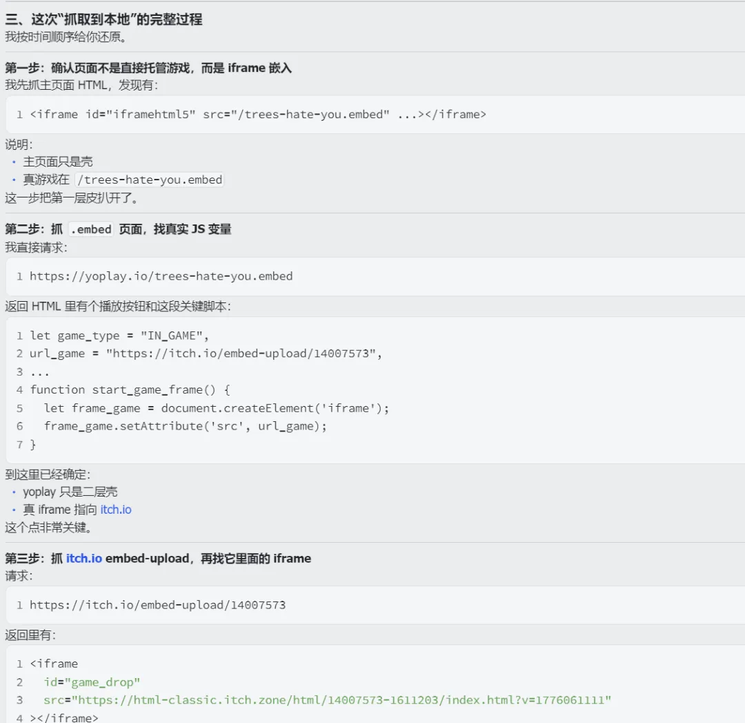 它没有直接猜游戏文件在哪。先抓 yoplay 主页面,找到 iframe 指向 /games-hate-you.embed。