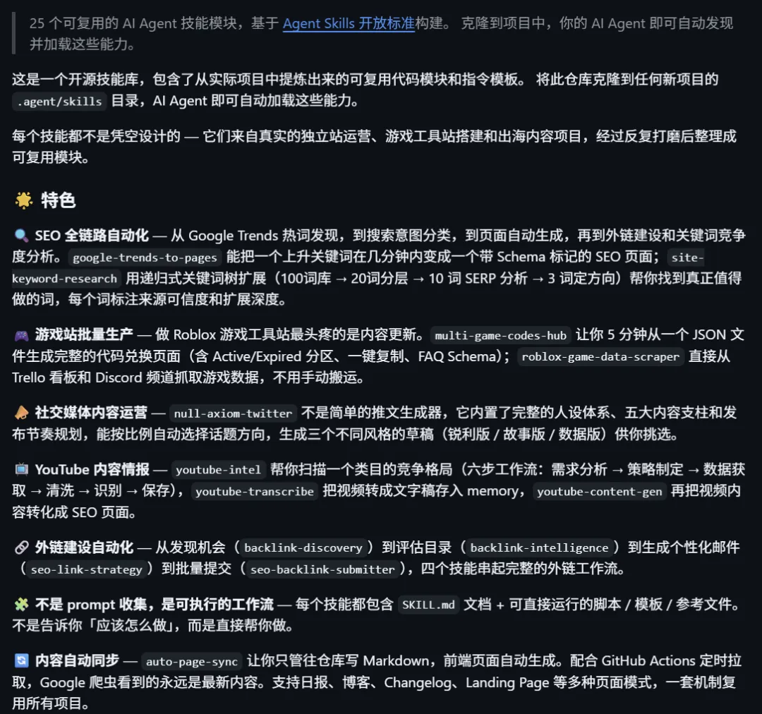 七鹿将最 近2年做出海站积累的脚本都skill化了,累计20多个,基本包括了全套做游戏站的各个环节,从找词、游戏站搭建、SEO优化、内容更新、自动外链等,都是开源的。可以给自己的openclaw或者hermes,开箱即用。