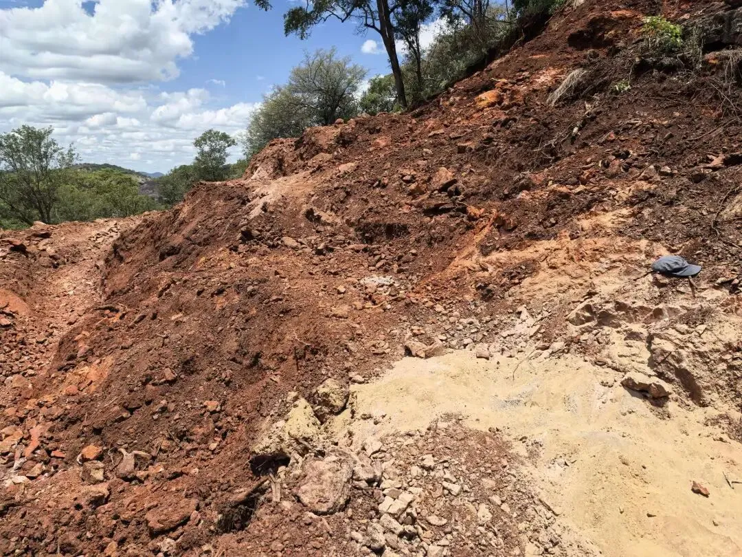 表层平缓的残积/坡积层(含金层所在):图片2的红褐色土质山坡、图片3的平缓山丘顶部,尤其是有散落石块(可能是矿化岩石碎块)或浅色沙土(可能含细粒金)的区域(如图片2中部的浅色沙土区域,需加密采样)。