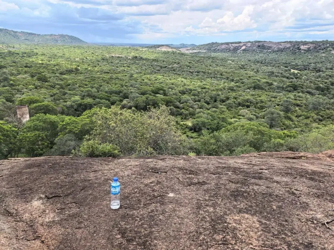 第三张图是自然景观,棕褐色大岩石、矿泉水瓶(勘查人员遗留)、森林、山丘、阴沉天气,示意该地区的自然环境,大岩石可能是花岗岩或绿岩的风化产物。