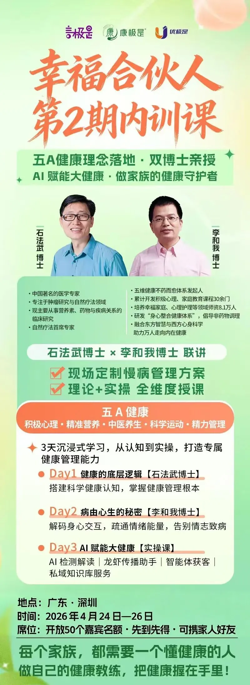 昨天我已买好4月23日去深圳的机票,很希望与您做同学,一起聆听石法武博士和李和我博士的5A健康课。