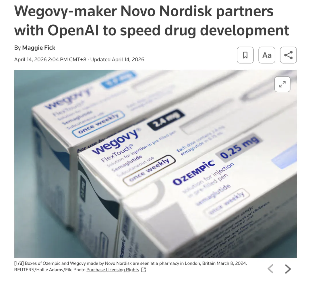 这意味着,OpenAI并不是要先证明“我能比别人更快画一个分子”,而是要先证明“我能把文献、数据库、内部知识、专业模型和研究者判断串成一条更高效的推理链”。这件事一旦成立,它改变的就不是一个工具点,而是研发前端的工作方式。Novo Nordisk与OpenAI的合作也说明了这一点:合作不只覆盖药物发现,还延伸到制造和商业环节,且Novo公开强调目标是“supercharge”科学家,而不是替代科学家。