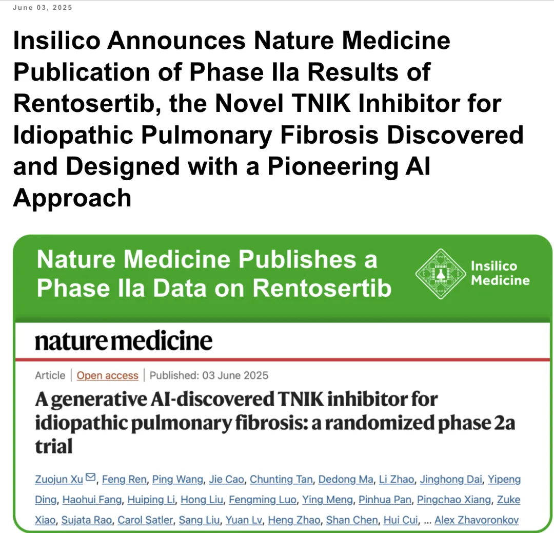 第六层,是平台转资产、资产进临床。代表是 英矽智能。英矽的重要性,在于它已经不只是平台叙事,而是进入“AI Biotech”逻辑:用AI找靶点、做分子、做资产,并把部分项目推进到临床和BD兑现。Rentosertib在IPF中的Phase IIa结果,以及与礼来的27.5亿美元潜在总额合作,使它成为少数已经把平台能力转成较硬产业结果的AI公司之一。